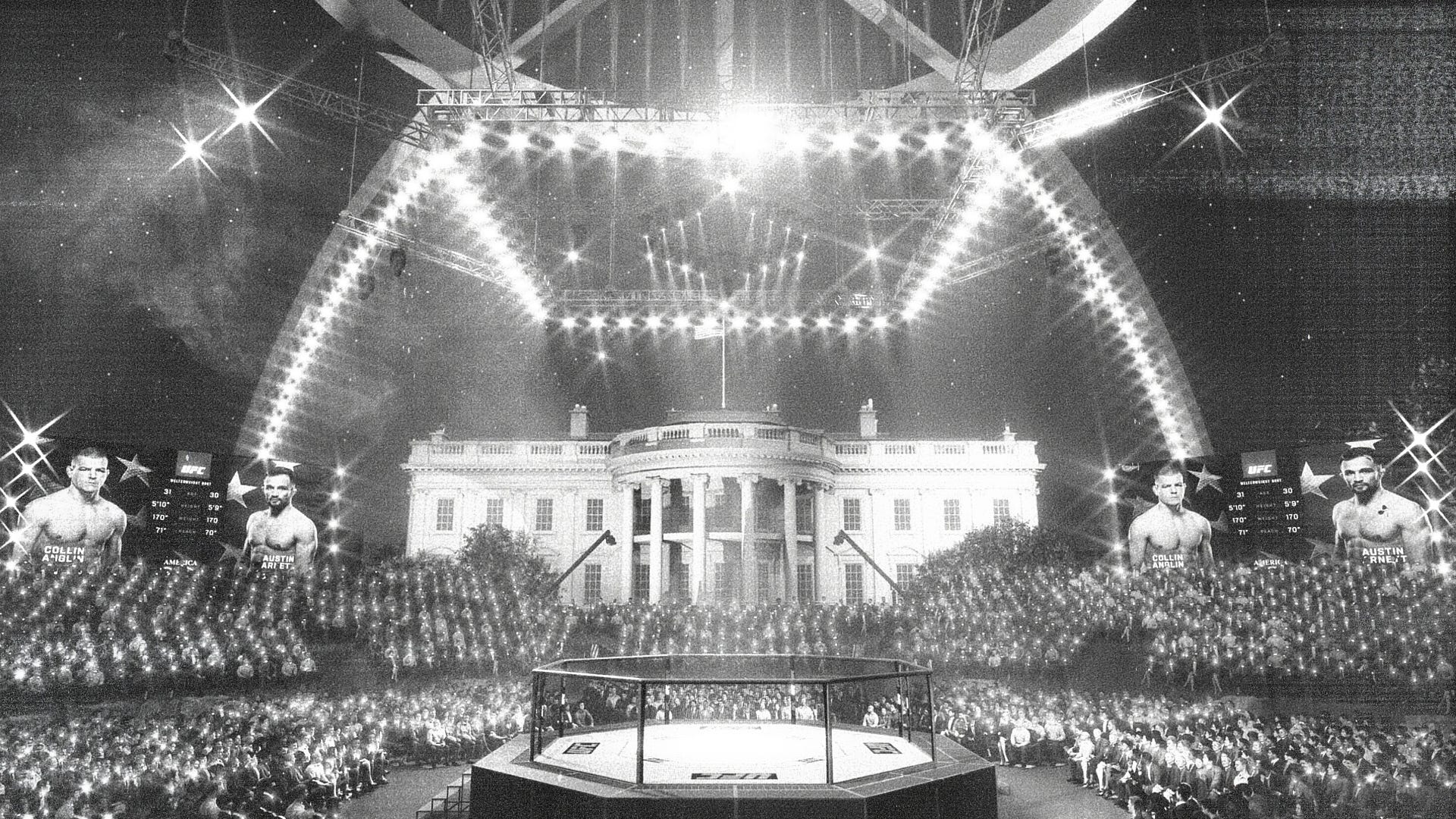 A UFC Octagon is erected on the White House lawn. The spectacle is drenched in red, white and blue chest-beating bravado while the most dated vision of manhood is broadcasted. Fireworks. Flag capes. Roars from over 5,000 patriots. Two shirtless men beating the shit out of each other until one’s knocked unconscious.