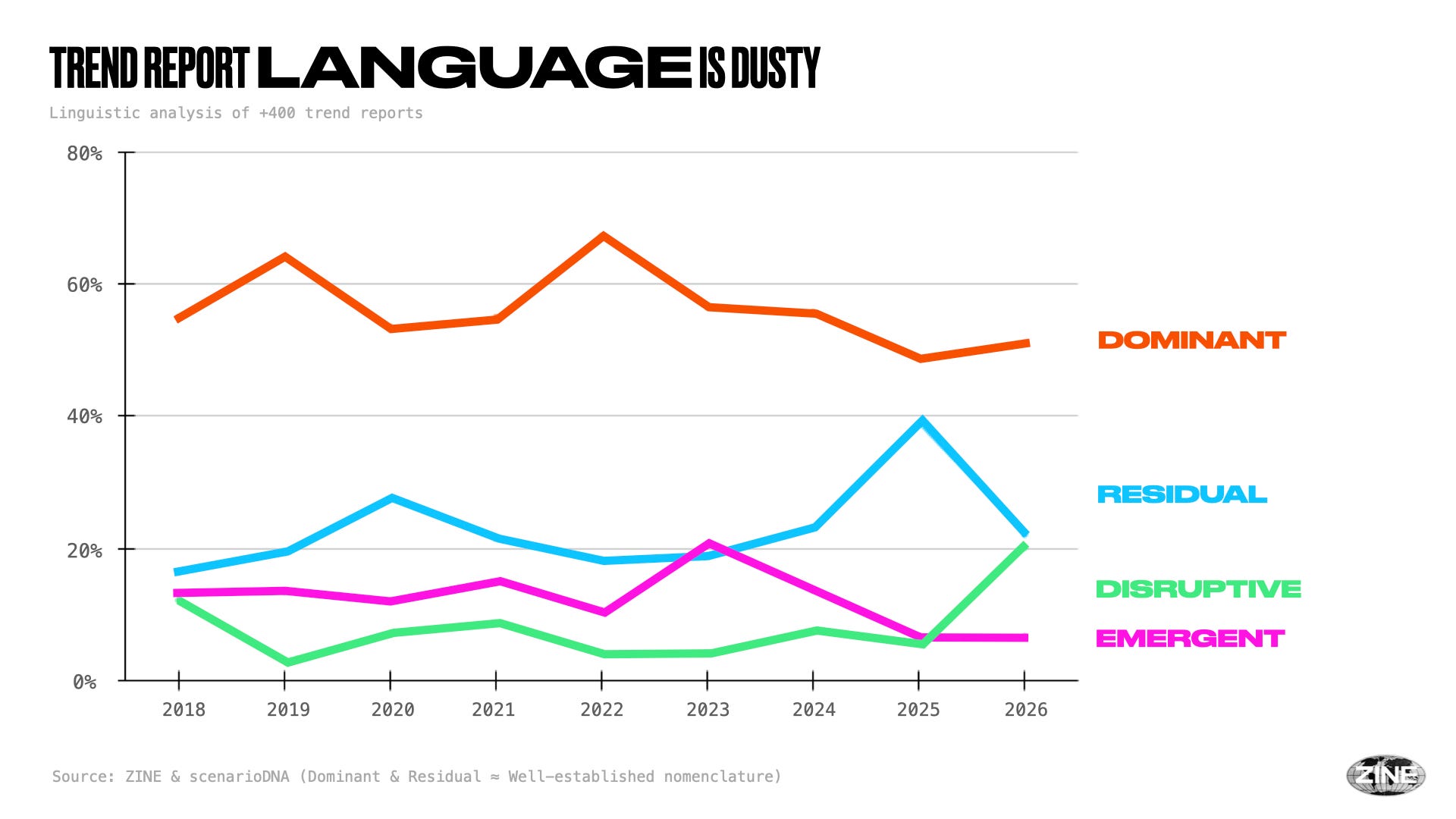 The intent from my first META Report in 2017 was that we can leverage reliability (all available reports) as a proxy for trend forecast accuracy. But over the years, I’ve found significant systemic flaws in these reports (ex. lack of methodologies, geographical and commercial biases, hyper-positivity, fear of risk, and perpetuated hype.) In further analysis, the vast majority of reports reveal “Dominant” or “Residual” language — i.e. well-established nomenclature... despite their task of reporting on the exact opposite.