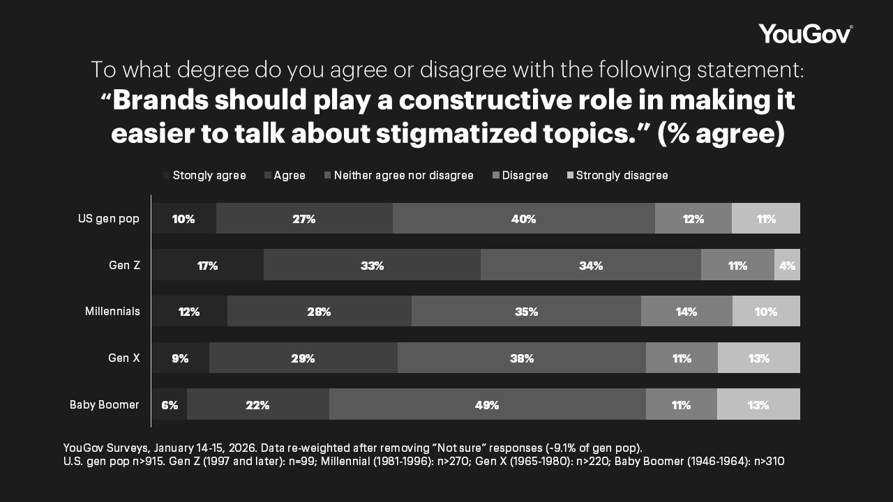 A third of Americans agree that brands should play a constructive role in destigmatizing culture. And while this reads like a soft plea, only 20% actively oppose organizational support. The remaining 80% are somewhere between supportive, uncertain and open — which is not a wall as much as an invitation for organizations to explore this role.