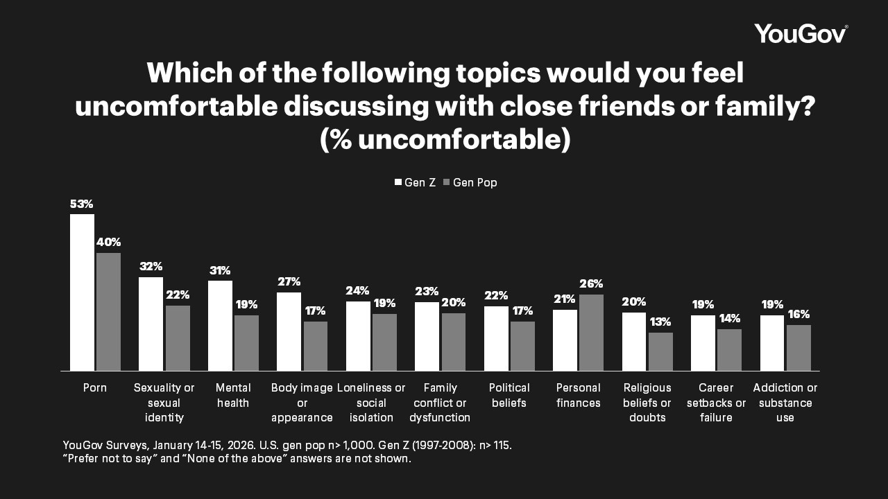 When it comes to discomfort around discussing taboos, Gen Z leads every other generation on almost every topic — sexuality (32% discomfort), mental health (31%), body image (27%), loneliness (24%), and political beliefs (22%). For religion (20%), Gen Z is nearly twice as uncomfortable discussing their beliefs than any other generation. The one topic where they’re actually less burdened than older cohorts is personal finances (21%) vs. Boomers (31%). Boomers are the most ashamed of personal finances and the least interested in destigmatizing it. Or put another way, Boomers carry the most discomfort and want the least done about it. As for Gen Z, perhaps their lack of discomfort around finances says more about shared, grim economic outlooks than the stigma of “money” itself.