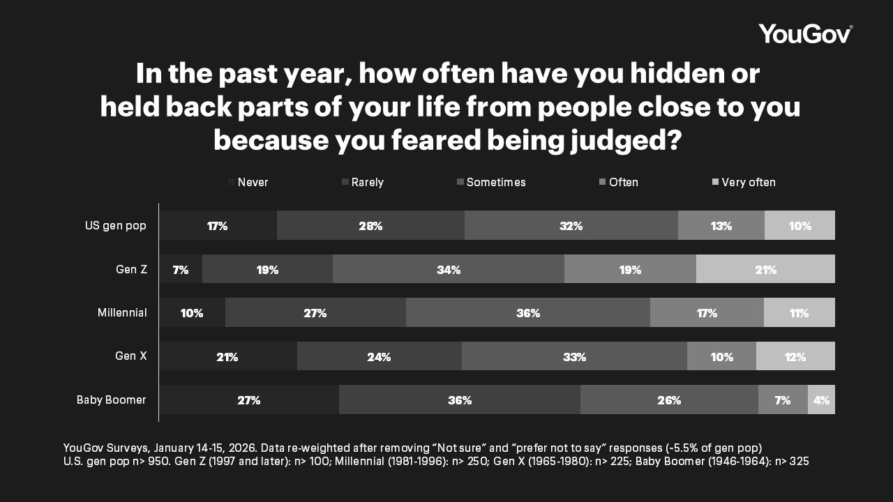 Gen Z is the most shame-burdened cohort across nearly every taboo measured – despite being the youngest surveyed and those deemed most “open.” But 40% of Gen Z hide parts of their lives from people close to them “often” or “very often” vs. 27% of Millennials, 22% of Gen X, and 11% of Boomers. The hypothesis is supported: the older you get, the less fucks you have to give.