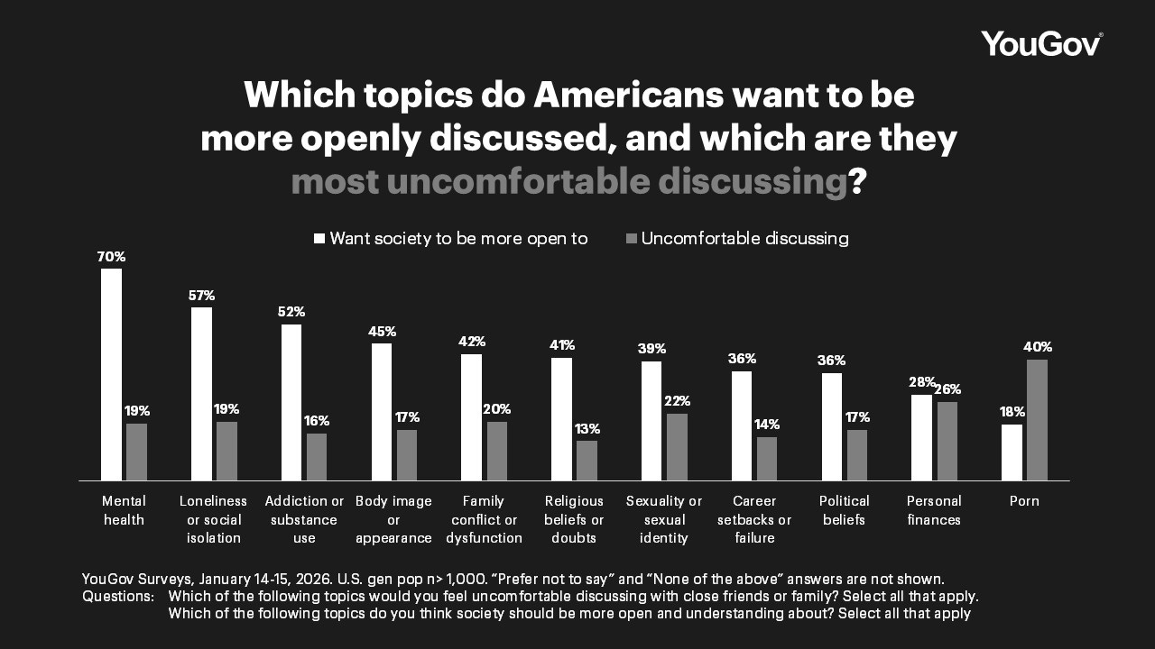 But one topic has broken through, revealing some hope: mental health. As a private burden, we’re tired of struggling in silence. Today, only 19% of Americans feel uncomfortable discussing mental health, while 70% want society to be more open discussing it. That 51-point gap is the largest of any measured taboo, representing progress. Decades of mental health destigmatization has made mental health a subject deemed worthy and necessary to talk openly about. But compare that preference for openness (70%) to family conflict (42%) or personal finances (28%) — much fewer want open conversations about these taboos, despite higher rates of discomfort around them.